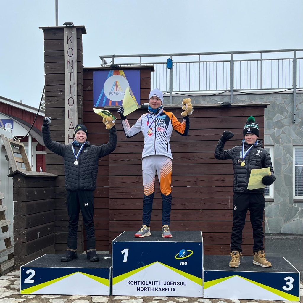 14-vuotiaiden mitalistit: Vinski (vas), Kontiolahden Santeri Repo ja Kauhajoen Leevi Kiukkonen. Kuva: Markku Ruotsalainen